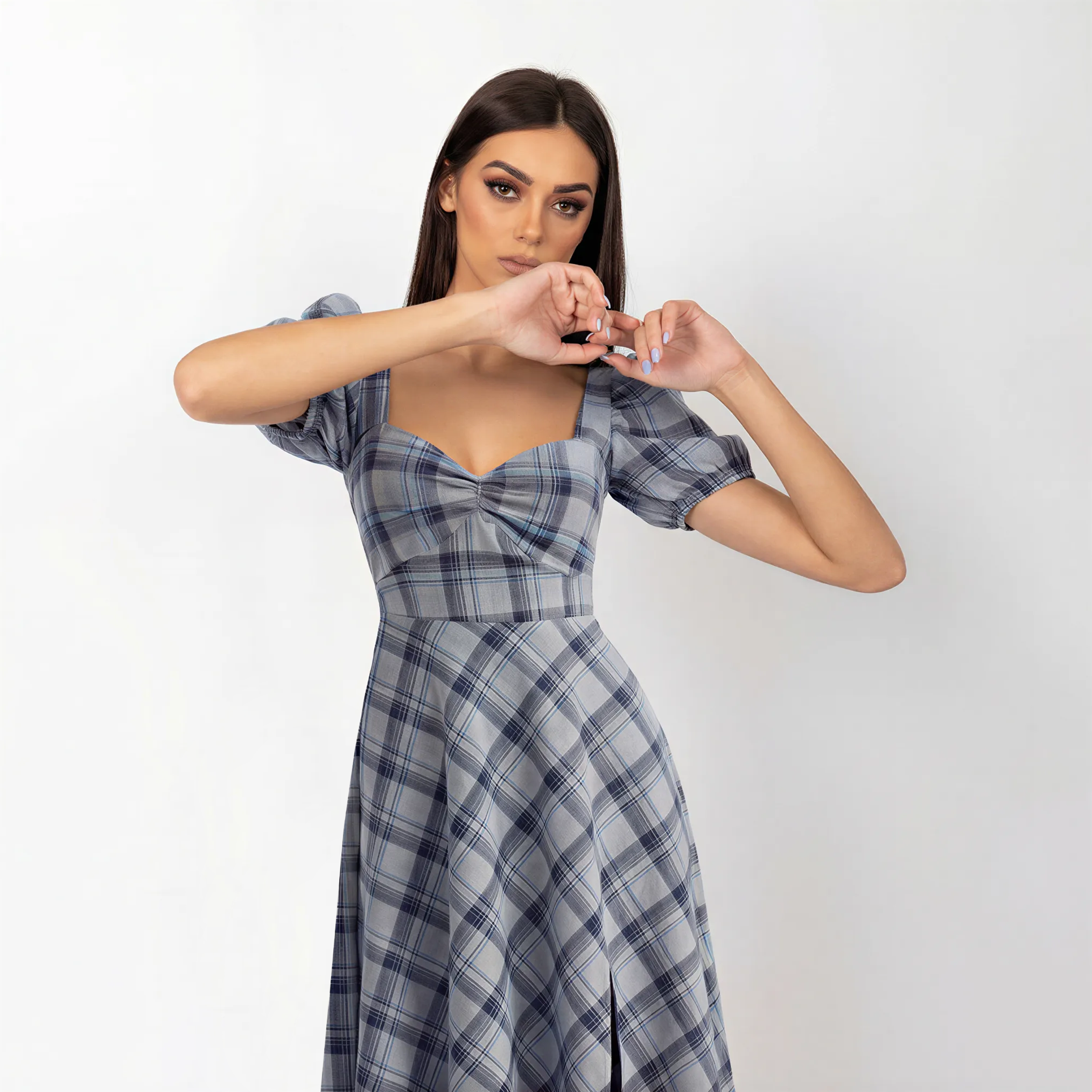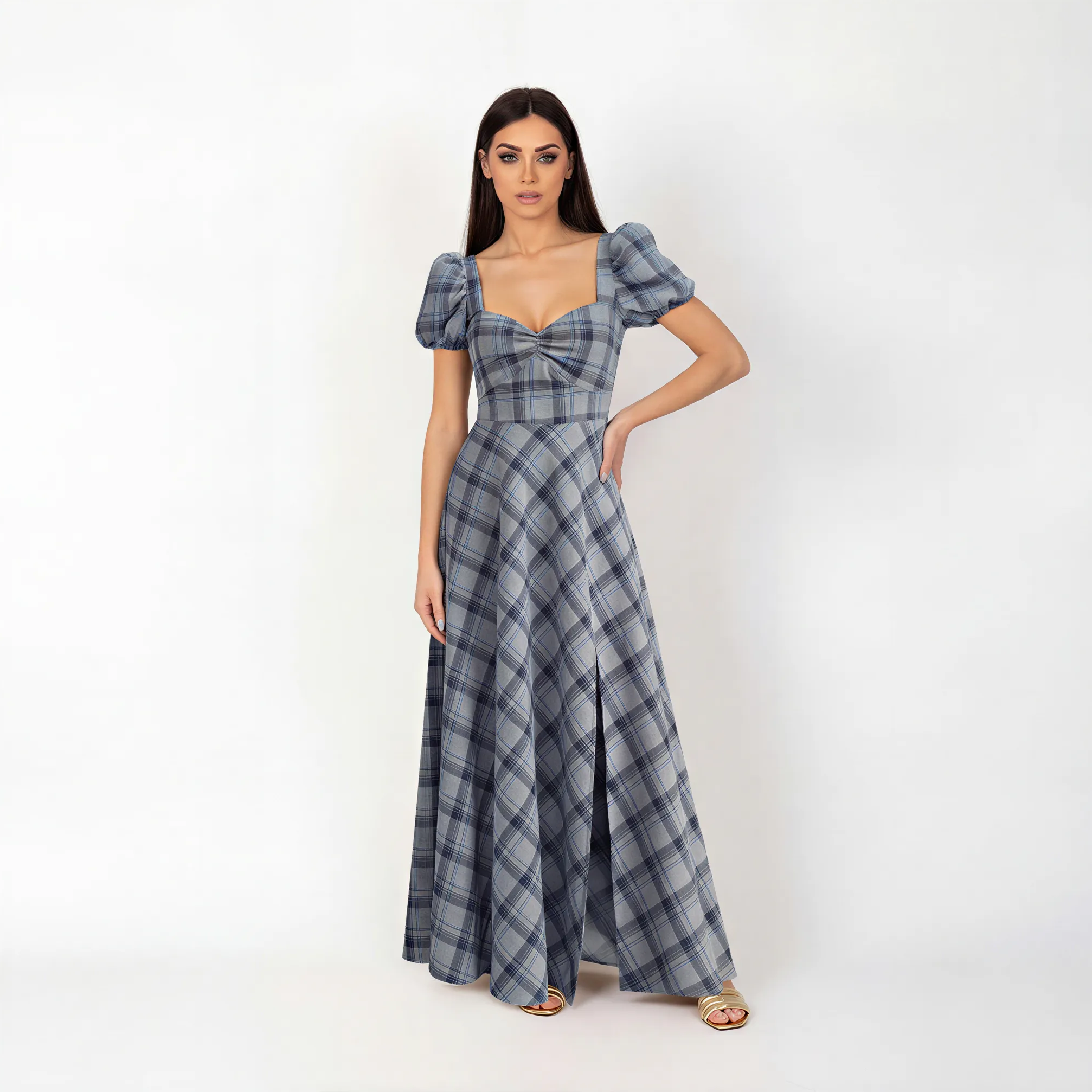 A structured corset dress in 100% cotton with a very pronounced waist that flatters and defines. The non-stretch fabric creates a sculptural drape, while the long silhouette reveals a front leg slit for movement. Timeless elegance for the woman who embraces confident, refined style.