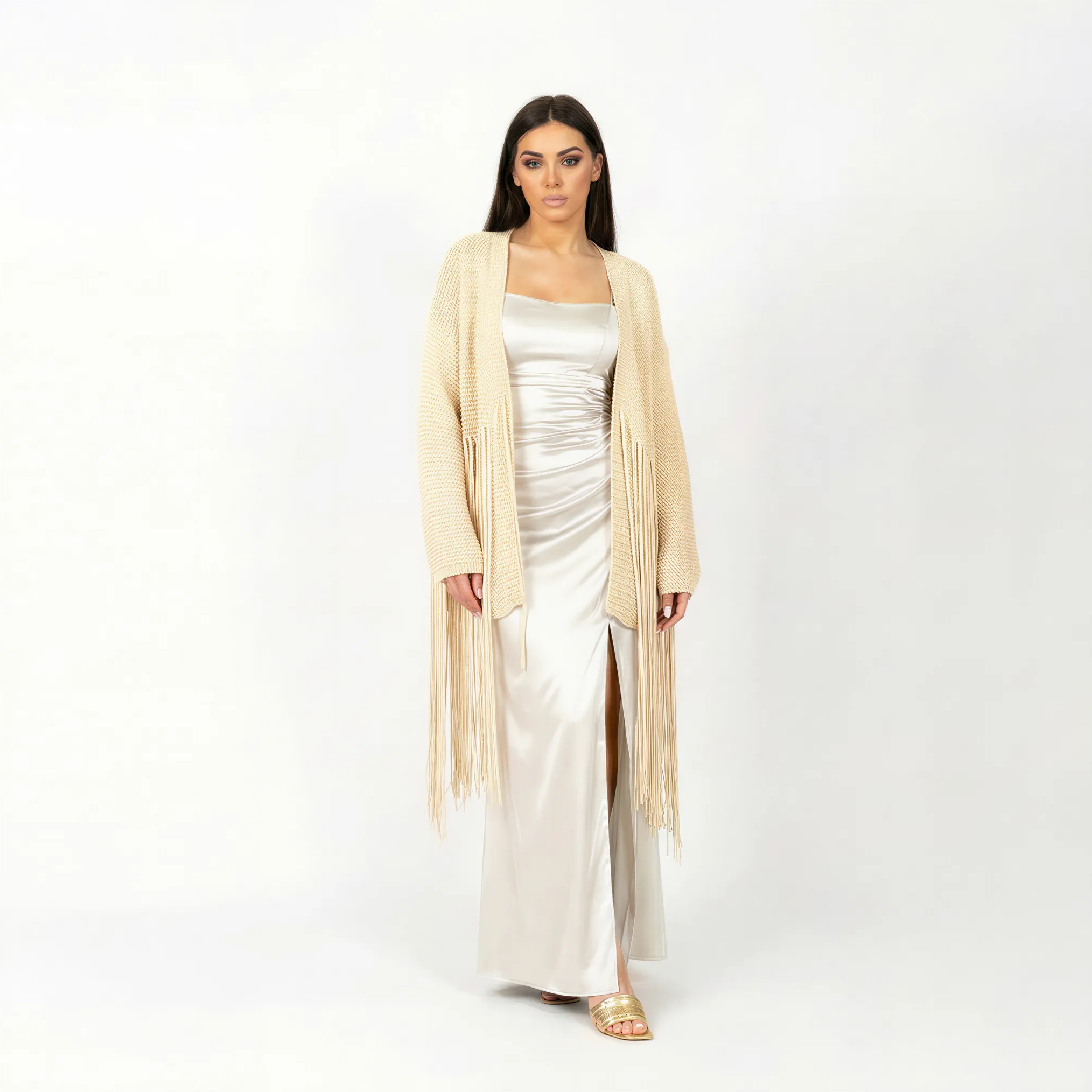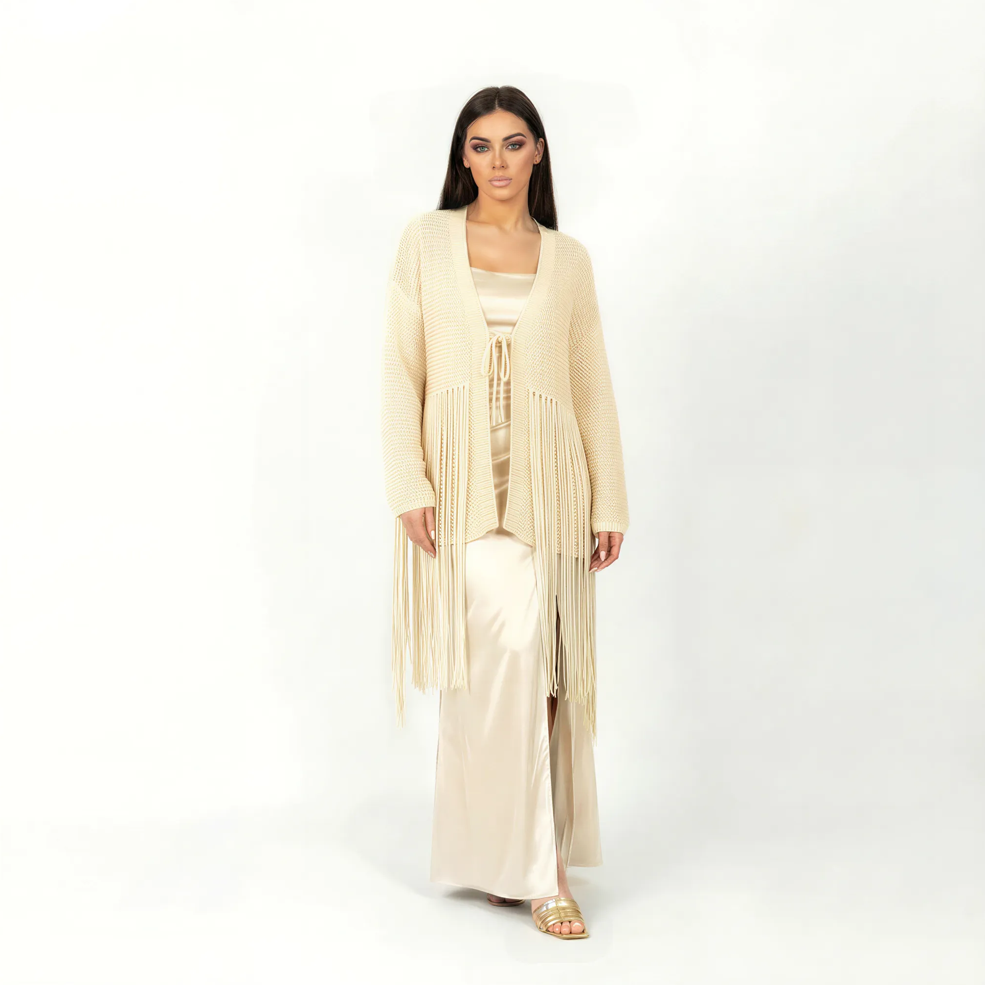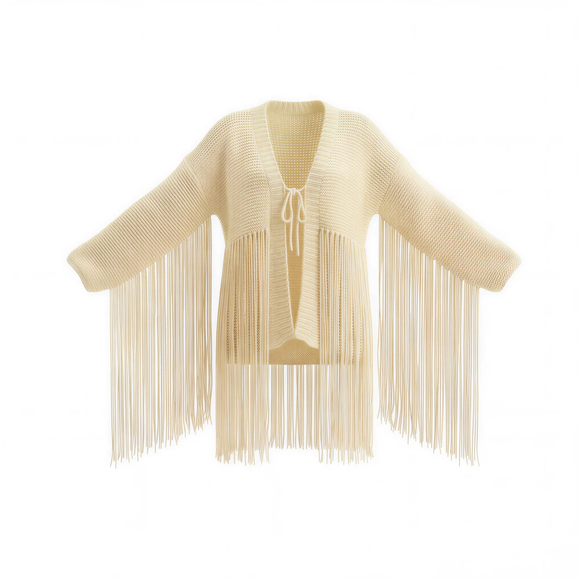 Handmade fringe jacket model sweater with artisanal charm. Soft, warm, and effortlessly attractive. The open-front design layers beautifully over any outfit, while playful fringes add movement and texture. Sustainable piece made with love.