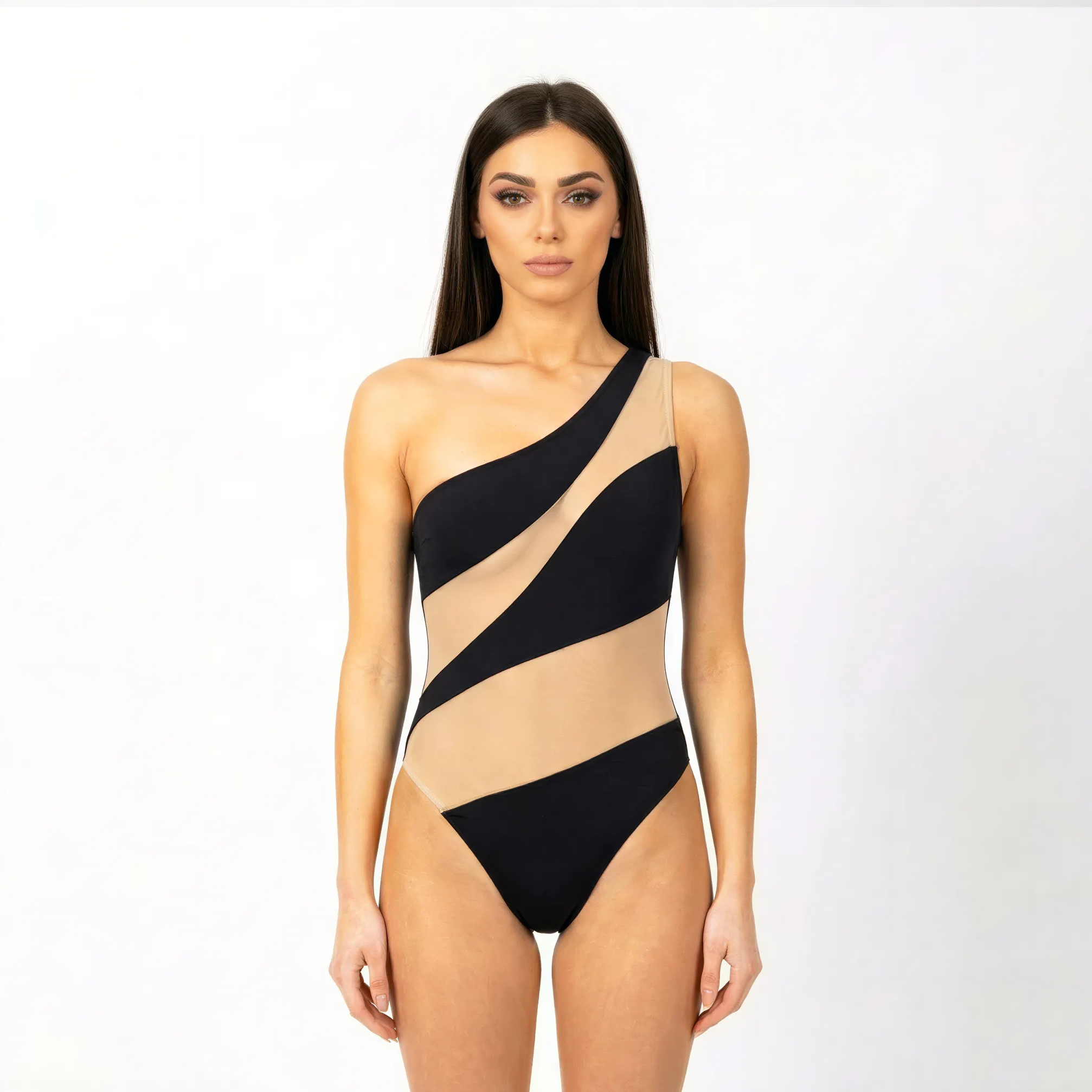 High-quality Italian Lycra in a classic black color that never goes out of style. Nude mesh combination with one holder strap. Made in Europe by a sustainable production company. True to size with excellent stretch. For the woman who values timeless elegance.