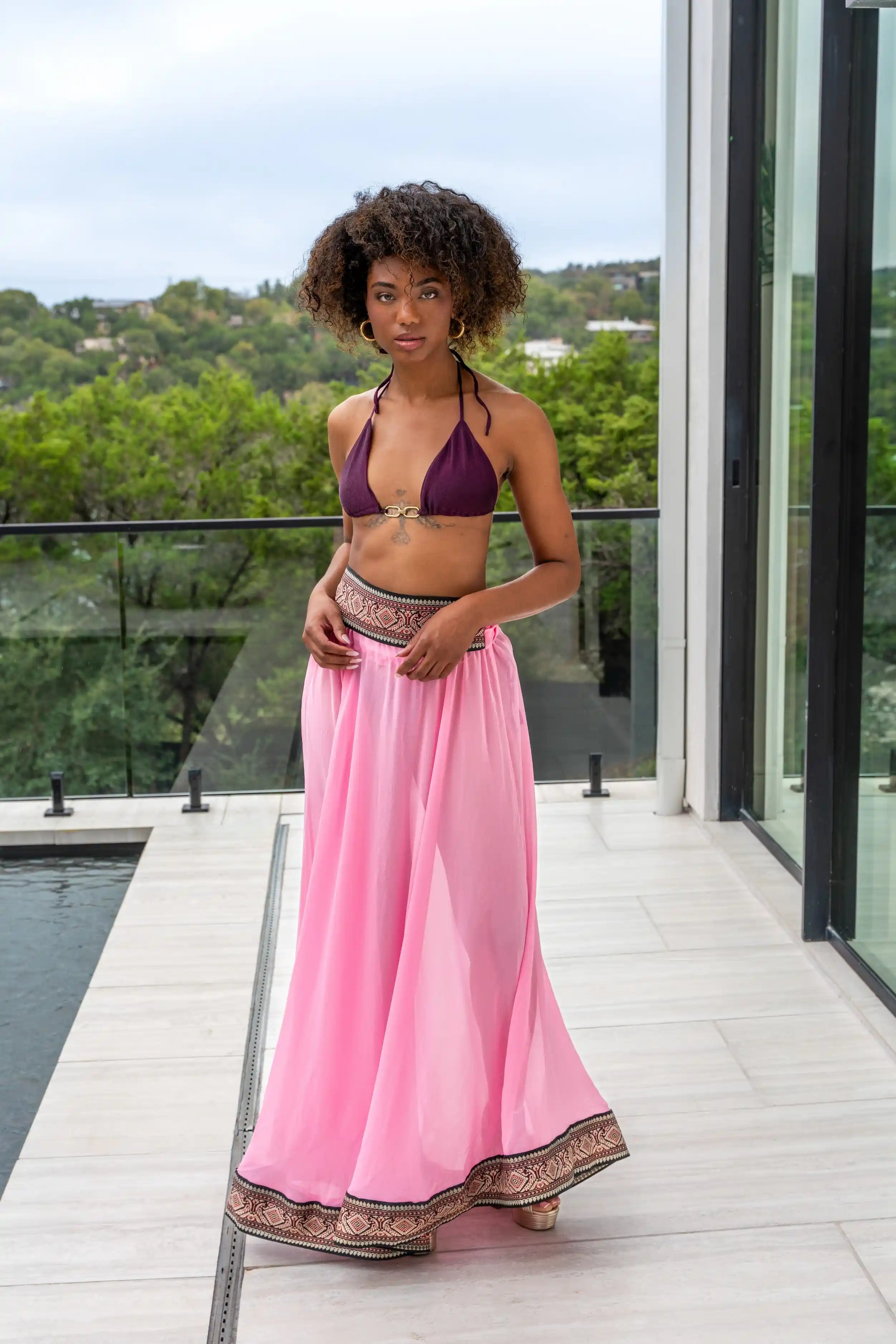 For the woman who loves versatility, the Natalie transforms from a long skirt to a dress top with effortless grace. A bit see-through with an etno embroidery belt and special ethnic border at the hem. Soft polyamide and viscose blend drapes beautifully, moving with her through every moment.